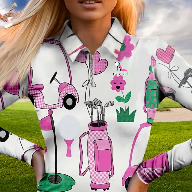 Stunning pink and white long-sleeve golf shirt, with SisterGolf Logo. Perfect for your next round of golf, or adding a pop of style to your weekend wardrobe.